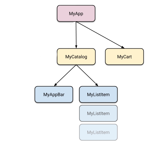 Экран каталога включает в себя пользовательскую панель приложений (MyAppBar) и прокручиваемое представление множества элементов списка (MyListItems).